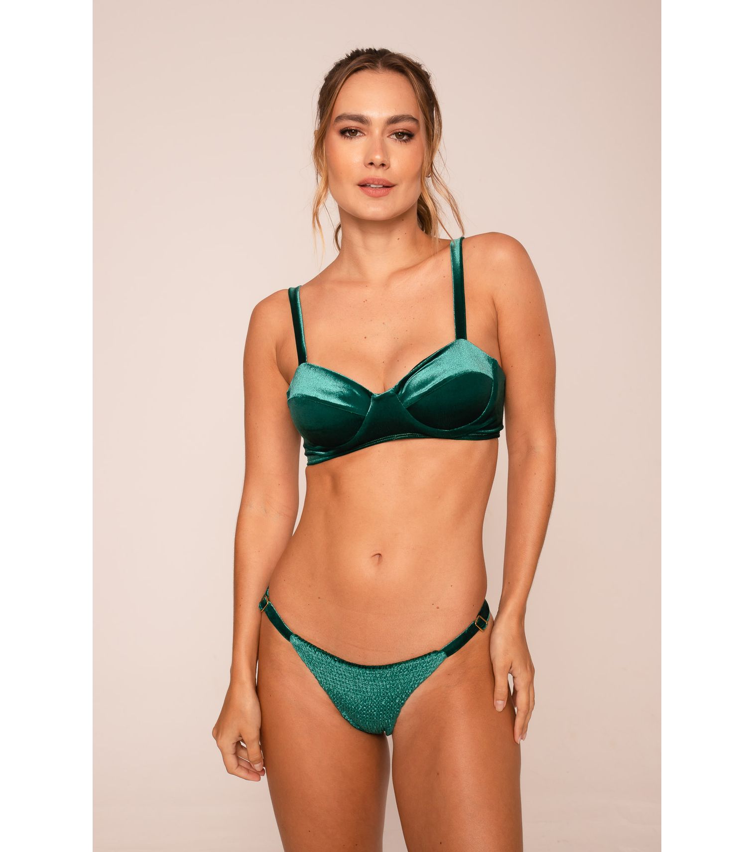 Top de biquíni maxi estruturado, cor verde veludo, com alças reguláveis, bojo removível e abotoador nas costas