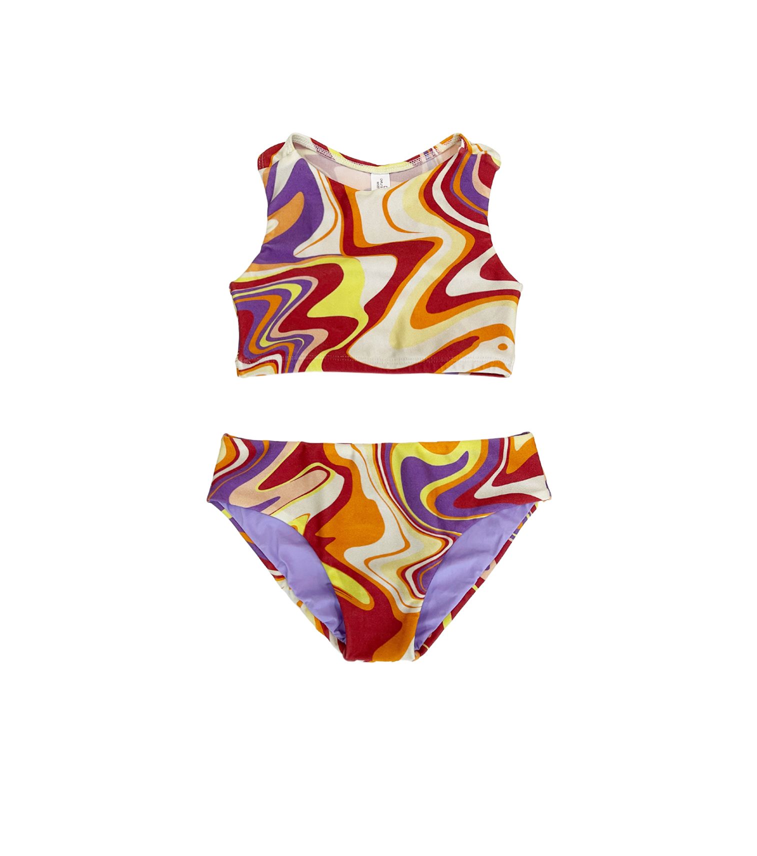 Biquíni infantil cropped nadador e calça dupla, estampa waves lavanda